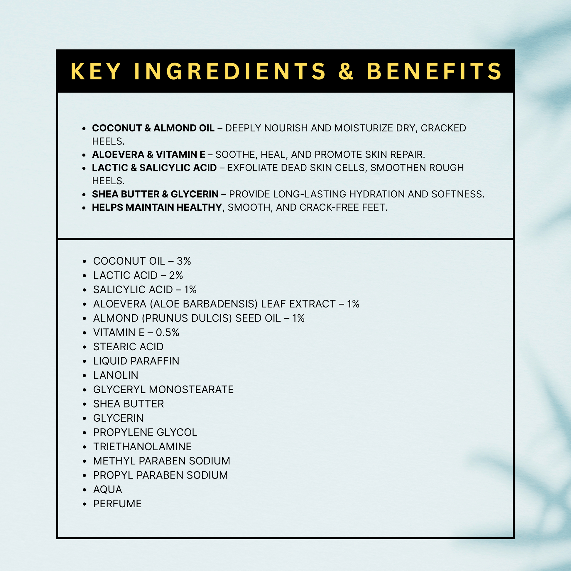 Heel Care Balm is formulated to nourish extremely dry, cracked heels with rich emollients and ayurvedic botanicals. With consistent use, it softens hard skin, reduces rough patches, and improves overall heel smoothness for sandal‑ready feet. Ideal for daily maintenance as well as intensive overnight care; results vary by routine and severity of dryness.