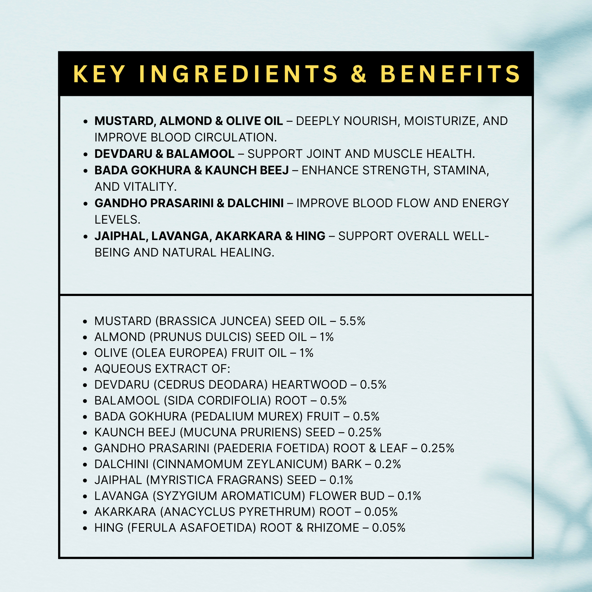 - Ayurvedic massage oil formulated to support local circulation and vitality in men.