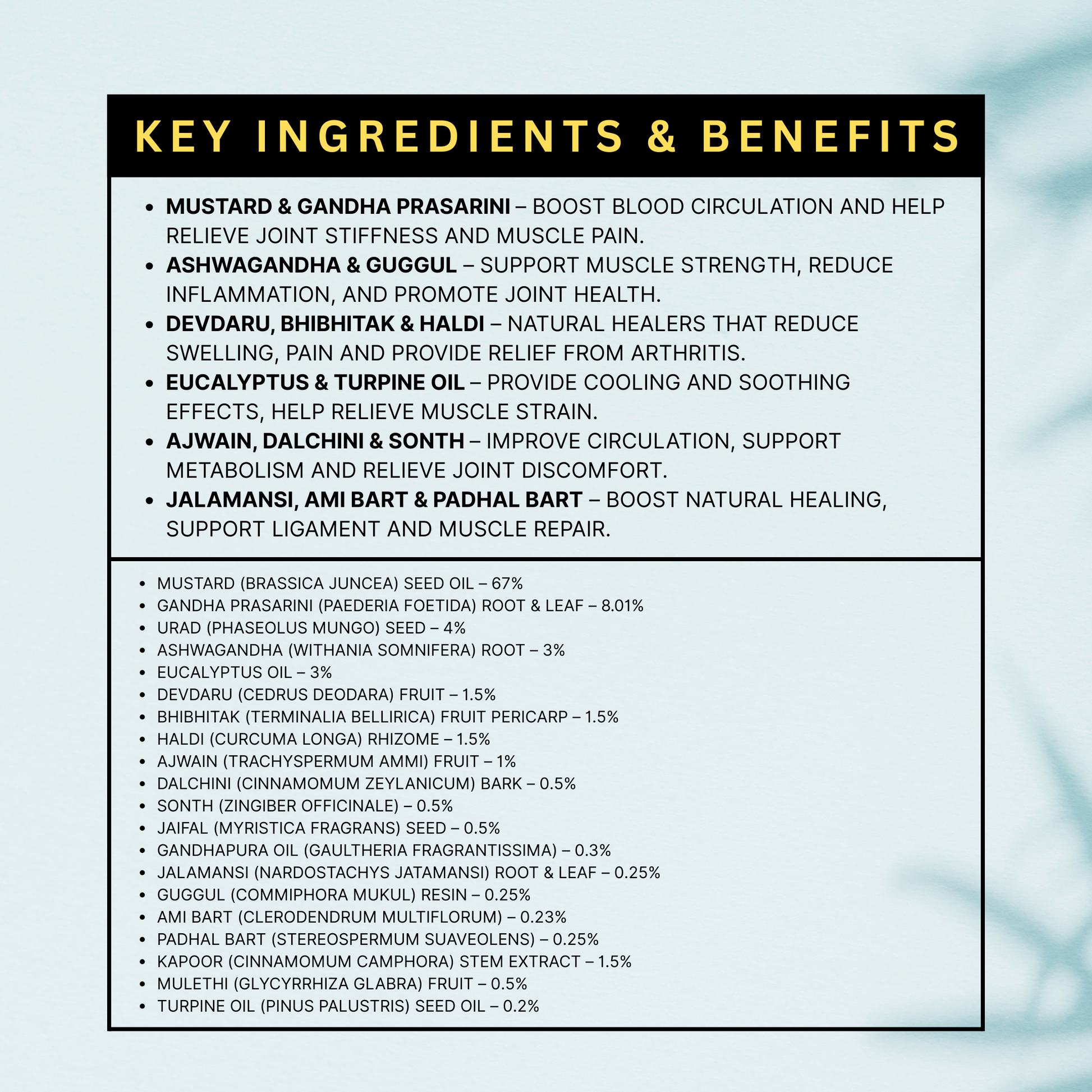 A powerful Ayurvedic oil blend formulated with herbal extracts to relieve arthritis, joint pain, spondylitis, and muscular stiffness while supporting long-term mobility and flexibility.
