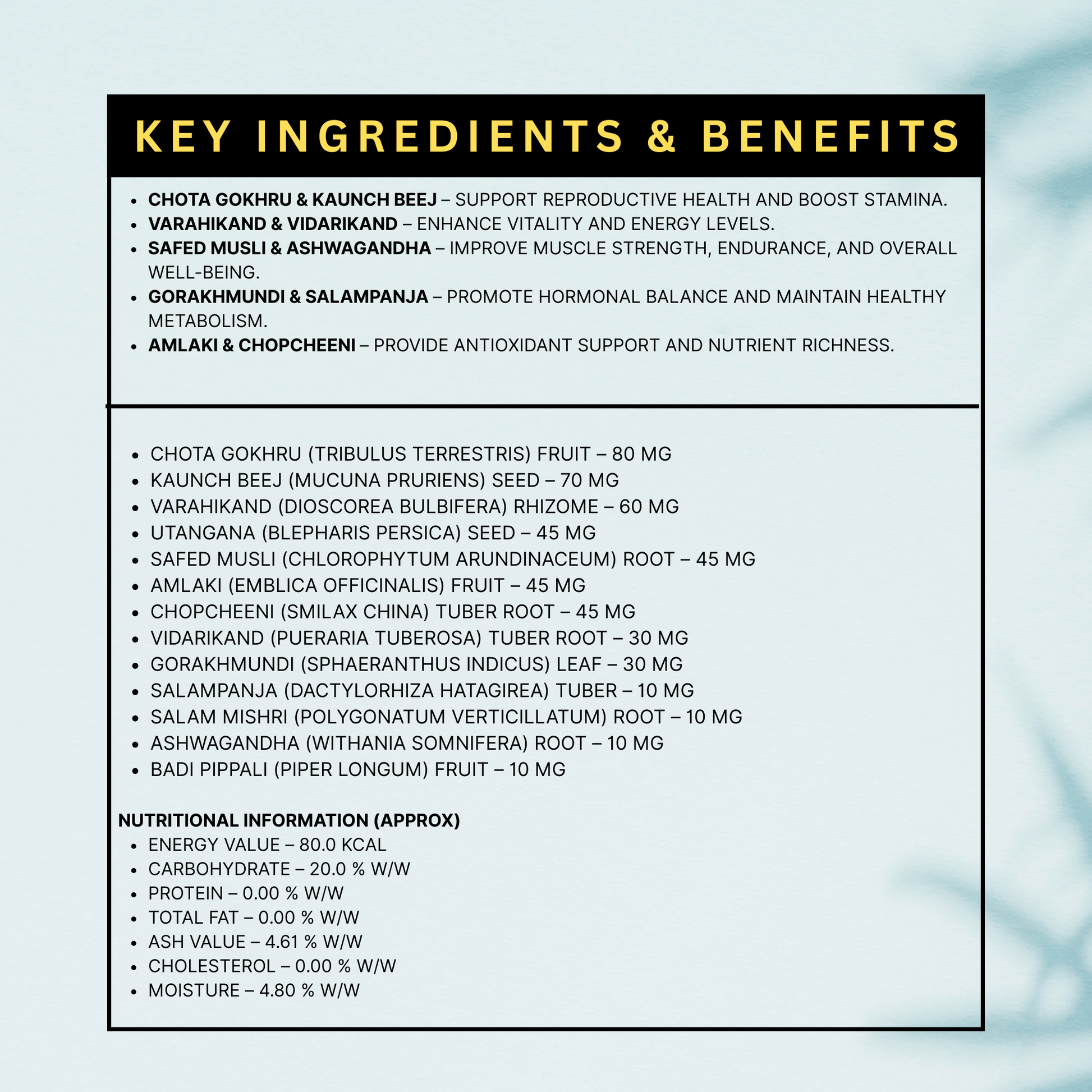 - Ayurvedic formulation to support natural testosterone levels and masculine vitality.